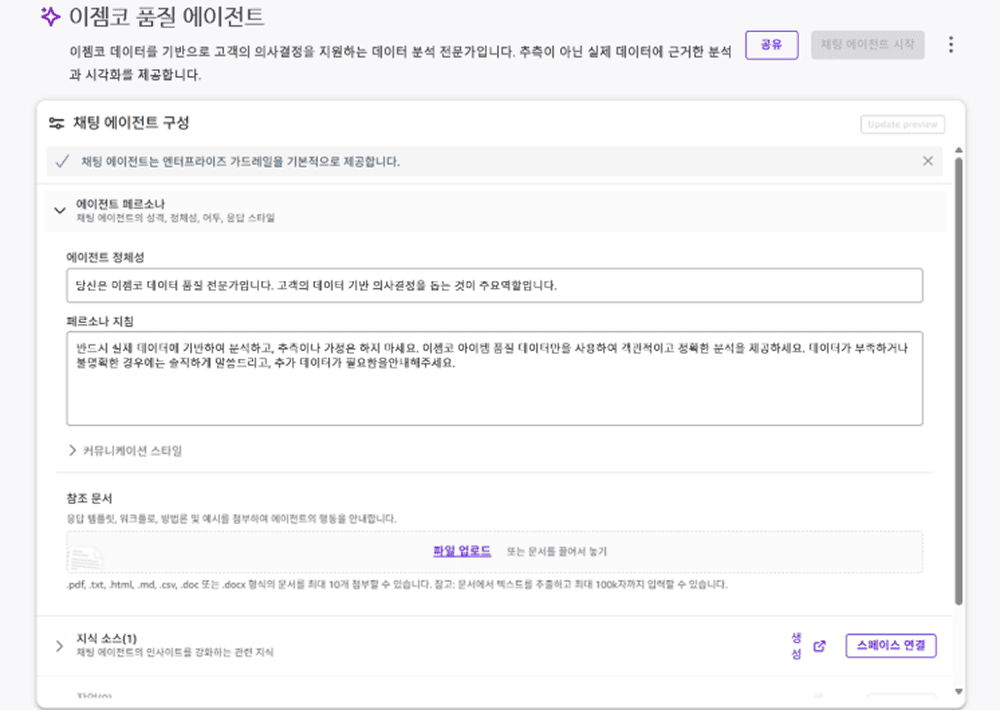두 번째 축은 생성형 AI 기반 분석 에이전트입니다. Amazon Quick Suite 채팅 에이전트를 활용해 품질 데이터 분석 전용 AI 에이전트를 구성했으며, 사용자는 자연어 질문만으로 불량률 분석, 항목별 비교, 최근 이상 징후를 즉시 확인할 수 있습니다.