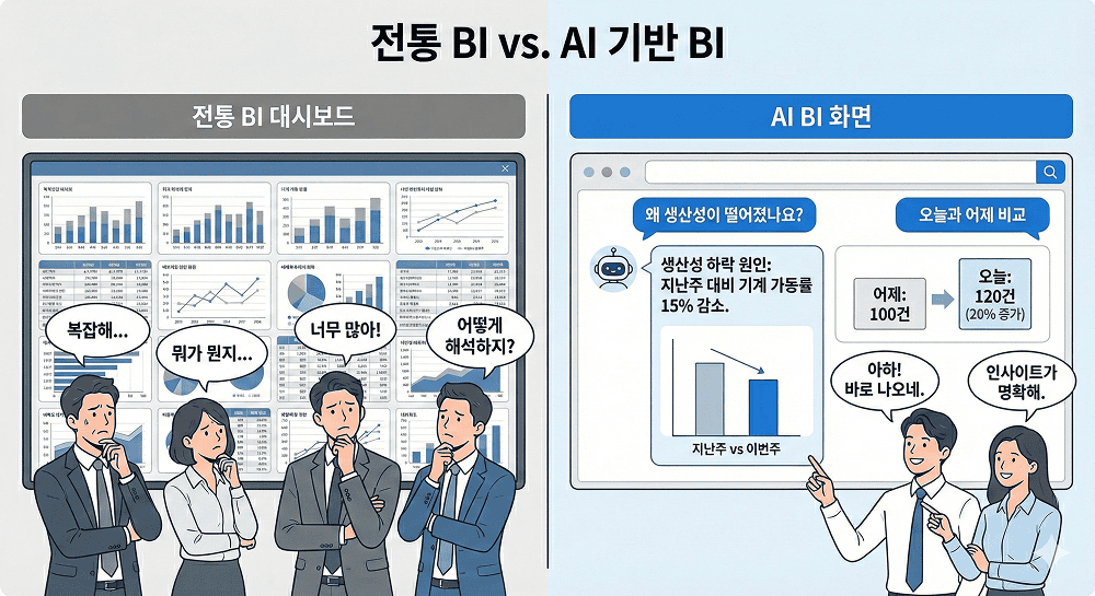 기존의 BI(Business Intelligence)는 정교한 대시보드를 만드는 데 초점이 맞춰져 있었습니다. 잘 설계된 차트와 리포트는 많았지만, 질문은 여전히 사람을 거쳐야 했죠. 데이터는 ‘보는 것’이지, ‘묻는 것’이 아니었습니다.