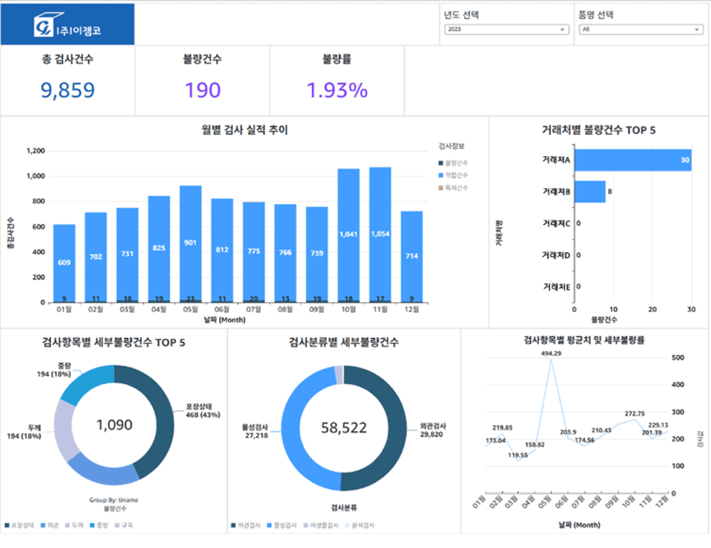 품질 데이터 분석 플랫폼의 첫 번째 축은 시각화 대시보드입니다. 운영 DB의 제조·품질 데이터를 안정적으로 수집·정제한 뒤, 분석 전용 데이터 계층을 구성해 월별 검사 실적, 전체 불량률, 항목별·거래처별 불량 TOP5 등 핵심 지표를 한 화면에서 확인할 수 있도록 구현했습니다.